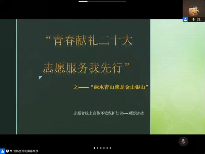 由于疫情防控,此次活动以线上方式开展——腾讯会议。活动包括(一)观看环保主题电影、(二)组织志愿者宣传环境保护知识。