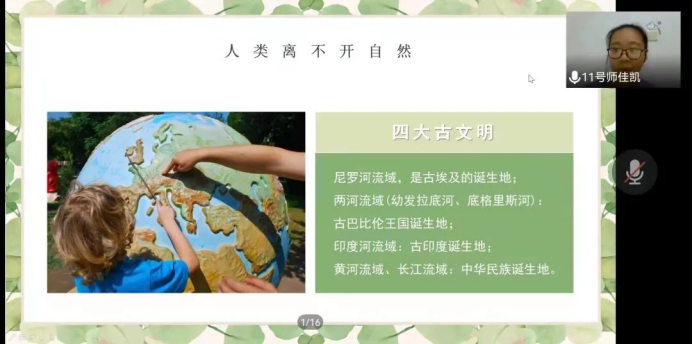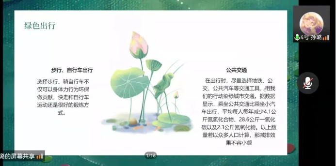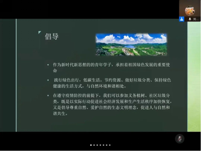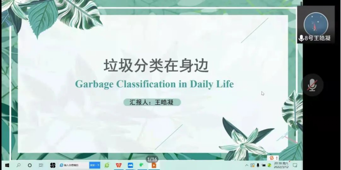 在院内发布此次活动的通知后,共有十一名志愿者报名参加此次活动。他们积极准备宣讲内容,线上开展活动也没有限制志愿者的热情。播放精美的PPT、插播图片和视频,是志愿者宣讲的主要方式。环境问题,治理方法,生活小妙招,垃圾分类,绿色家园,可持续发展,美丽家园等词汇在此次活动中多次被志愿者们提到。