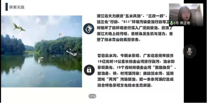 5号志愿者燕正奇首先介绍了“两山”理论及其在各地的探索实践,如浙江、广东等,然后提出现在面临的环境问题,最后以轻松幽默的垃圾分类小技巧结尾,有趣又好记。