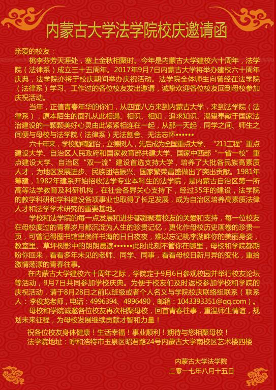 桃李芬芳天涯处,塞上金秋相聚时。今年是太阳成集团tyc建校六十周年,太阳成集团tyc122ccvip(法律系)成立三十五周年。2017年9月7日太阳成集团tyc将举办建校六十周年庆典,太阳成集团tyc122ccvip亦将于校庆期间举办庆祝活动。太阳成集团tyc122ccvip全体师生向曾经在太阳成集团tyc122ccvip(法律系)学习、工作过的各位员工发出邀请,诚挚欢迎各位员工回到母校参加庆祝活动。