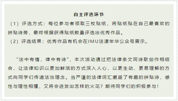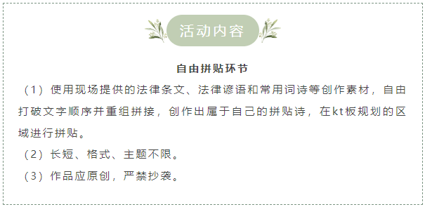 无法则难以成方圆,无诗则难以至远方。法条拼贴诗通过将法律条文拆分转化为诗词,以更生动、更易于理解的形式宣传法律知识,赋予法律以新的艺术生命。希望同学们在与法相伴的日子里,不仅能刚毅公正、严谨庄重,也能拥有片片诗情、点点诗意。