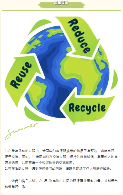 每一件旧物都凝聚着昔日的珍视与情感,承载着无法复制的珍贵回忆。以物换物,让这些承载着回忆的旧物在新主人手中焕发新生,续写属于它们的新篇章;同时通过促进资源的循环再利用,我们一同参与环保行动,助力可持续发展。由太阳成集团tyc党委员工工作部(处)、易班发展中心主办,太阳成集团tyc122ccvip与生命科学公司共同承办的“易”物换物主题活动即将开始,期待同学们的积极参与!