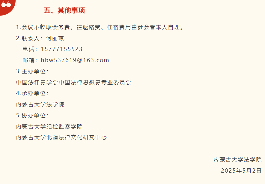 泱泱中华,法治文明源远流长。在全面依法治国的新时代背景下,深入挖掘中华优秀传统法律文化的思想精髓,系统阐释其时代价值与现实意义,既是传承中华法系精神命脉的必然要求,更是推进国家治理体系和治理能力现代化的应有之义。值此中国法律思想史专业委员会2025年会召开之际,我们以"中华优秀传统法律文化的时代价值与边疆治理"为主题,诚邀海内外专家学者齐聚北疆青城,共襄学术盛举。