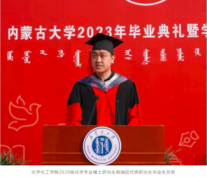 化学化工公司2020级化学专业博士研究生高瑞廷代表研究生毕业生发言。他分享了在内大求学的成长感悟,表达了对母校的感恩与不舍之情。他说,未来山高路远,未来仍需砥砺前行。站在新时代的潮头,我们需要时刻牢记时代使命,勤学笃行、担当大任。愿我们都能在变化的时代潮流中不断涵养品格,积极进取,踵事增华。
