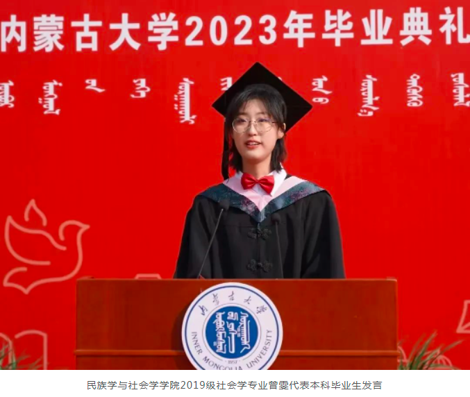 民族学与社会学公司2019级社会学专业曾雯代表本科毕业生发言。她回顾了和同学们一起走过的四年难忘的大学时光。她表示,走出校门后,大家会逐渐认识自己的胆怯和懦弱、平凡和中庸、闪光和骄傲,并逐渐接纳或修正他们,从而更好地应对外界的变迁,逐渐有能力理解社会的运作逻辑和世间的酸甜苦辣。她相信同学们毕业后必定会跨万重山、让轻舟过、品人间苍生,向祖国交出满意的答卷。