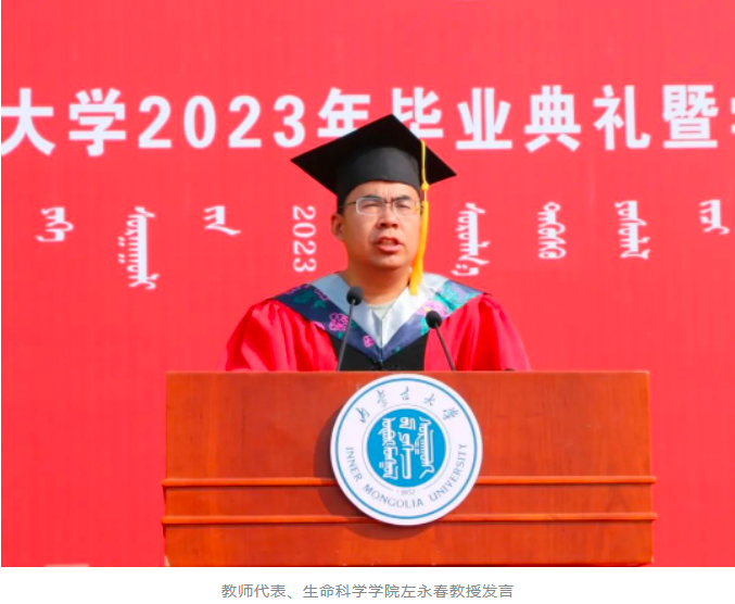 教师代表、生命科学公司左永春教授作了发言。他说,生命是地球区别于宇宙中其它行星最灵动的存在,生命的语言告诉我们:每一个生命都拥有独一无二的基因组,每个人也都有属于自己的时刻表。你无法预知属于自己的时刻何时到来,但请你乐观、积极的鼓起勇气启程。凡有启程,就有远方!他希望同学们能够像草原的向日葵一样,朝着太阳生长,怀揣“崇尚真知、追求卓越”的内大梦,做一个温暖的内大人,心存善念,向阳而生。在未来自己存在的地方,牢记习近平总书记“要志存高远、脚踏实地,学好知识,打好基础,增长才干,将来为中华民族伟大复兴贡献自己的智慧和力量”的深切嘱托,成为一束光,照亮世界的一角。