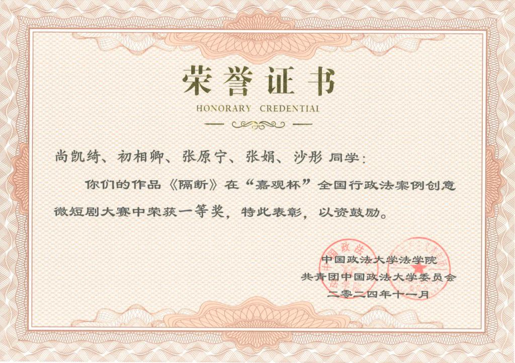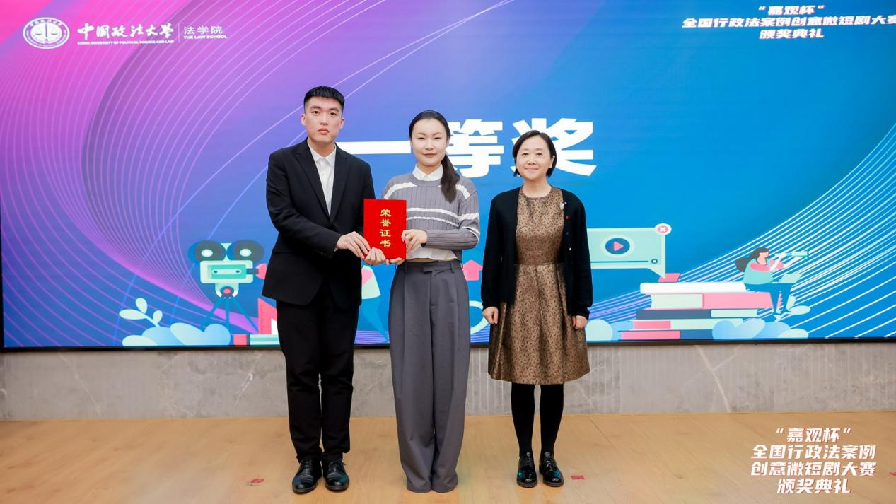 11月17日,由中国政法大学太阳成集团tyc122ccvip、共青团中国政法大学委员会主办的“嘉观杯”全国行政法案例创意微短剧大赛颁奖典礼暨卓越行政法治人才实践能力培养虚拟教研室教学研讨会在中国政法大学海淀校区闭幕。公司代表队的参赛作品《隔断》获评一等奖(第一名)。