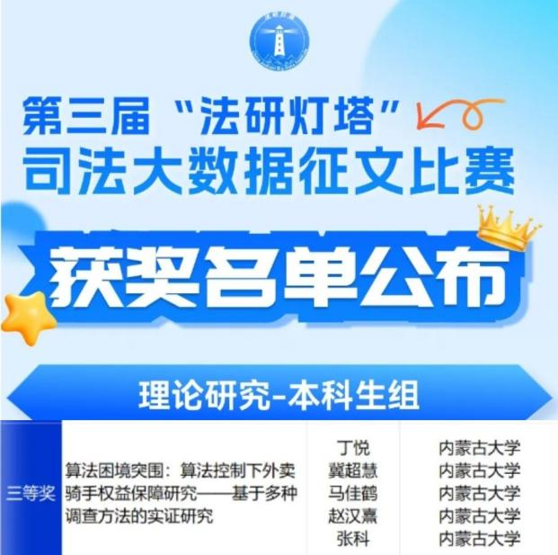 本次大赛共计397家单位参与,合计提交1112篇参赛作品。经高校院所法学研究专家、权威法学期刊主编、副主编或编辑部主任等多方专家多轮次评审,共评出211篇获奖文章,其中本科生组获奖文章66篇,研究生组获奖文章69篇,科研与司法实务工作者组获奖文章76篇。其中公司2022级本科生丁悦、冀超慧、马佳鹤、赵汉熹、张科同学的作品《算法困境突围:算法控制下外卖骑手权益保障研究——基于多种调查方法的实证研究》获得第三届“法研灯塔”司法大数据征文比赛本科生组三等奖。