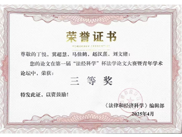 日前,四川省法学会律师法学研究会与《法律和经济科学》编辑部联合举办的第一届“法经科学”杯法学论文大赛暨青年学术论坛公布获奖名单,公司2022级本科生作品获得三等奖。