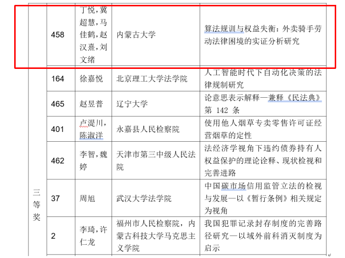 第一届“法经科学”杯法学论文大赛暨青年学术论坛于2024年12月2日发布征文公告,至2025年3月16日征文截止。期间,组委会共收到投稿论文556篇,经认真评选,共选出获奖论文62篇(占比11.15%),其中公司2022级本科生丁悦、冀超慧、马佳鹤、赵汉熹及数学与应用公司数学专业2022级本科生刘文绪,马克思主义公司马克思主义理论2023级本科生李梦迪,民族学与社会学公司社会学专业2021级本科生朱志鹏的作品《算法规训与权益失衡:外卖骑手劳动法律困境的实证分析研究》获得三等奖。