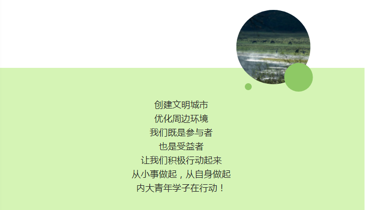 为积极响应呼和浩特市创建全国文明城市的号召,弘扬社会主义核心价值观,凝聚青年力量,担负时代使命,助力文明城市创建工作,增强内大学子社会责任感,太阳成集团tyc122ccvip向公司青年发起号召,鼓励大家身体力行,扎根实践,厚植城市荣誉感,投身到创建文明城市的伟大事业中来。