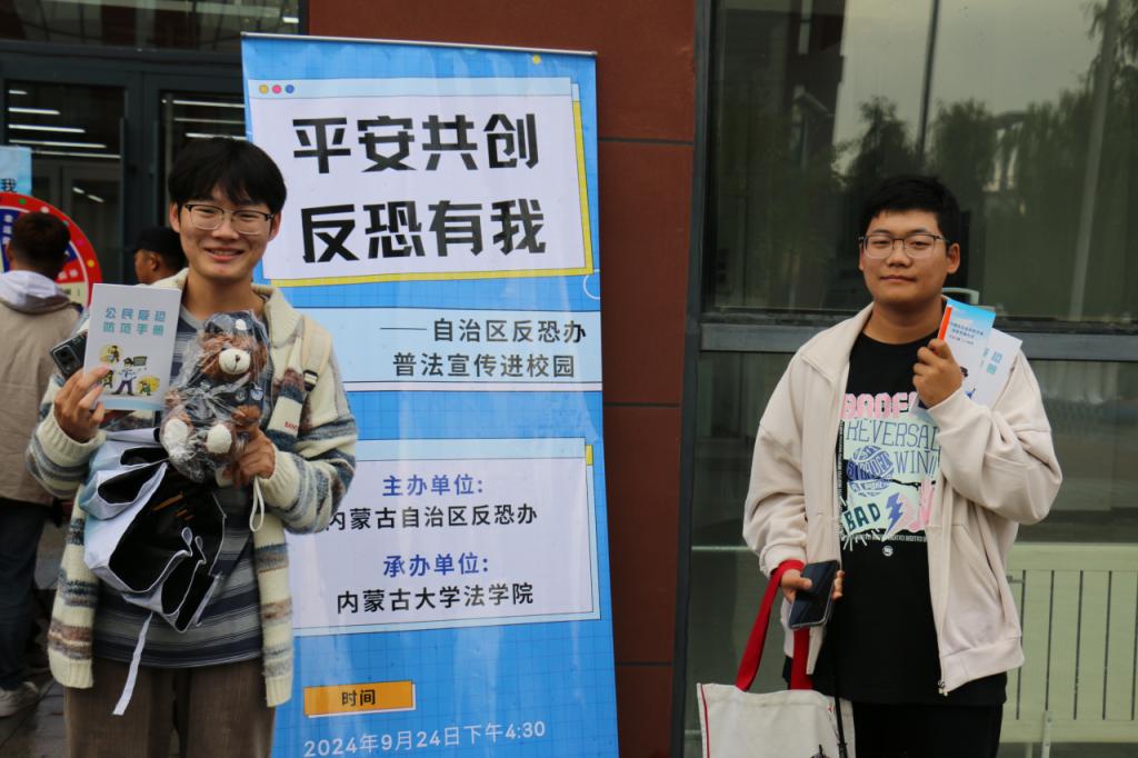 为达到良好的普法效果,此次活动为同学们准备了《中华人民共和国反恐怖主义法》法律读本和公民反恐防范手册等宣传读物,不仅系统介绍了反恐怖主义法的基本内容、重要意义,还通过生动的案例分析让大家更加直观地理解法律条文,学习实用的反恐知识和技能,明确自己在反恐斗争中的角色与责任。