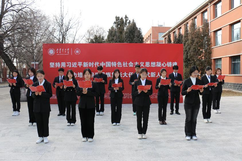 大家手持宪法文本,齐声诵读宪法节选内容。诵读声铿锵有力,回荡在校园上空,在诵读中感悟着宪法的威严与神圣。
