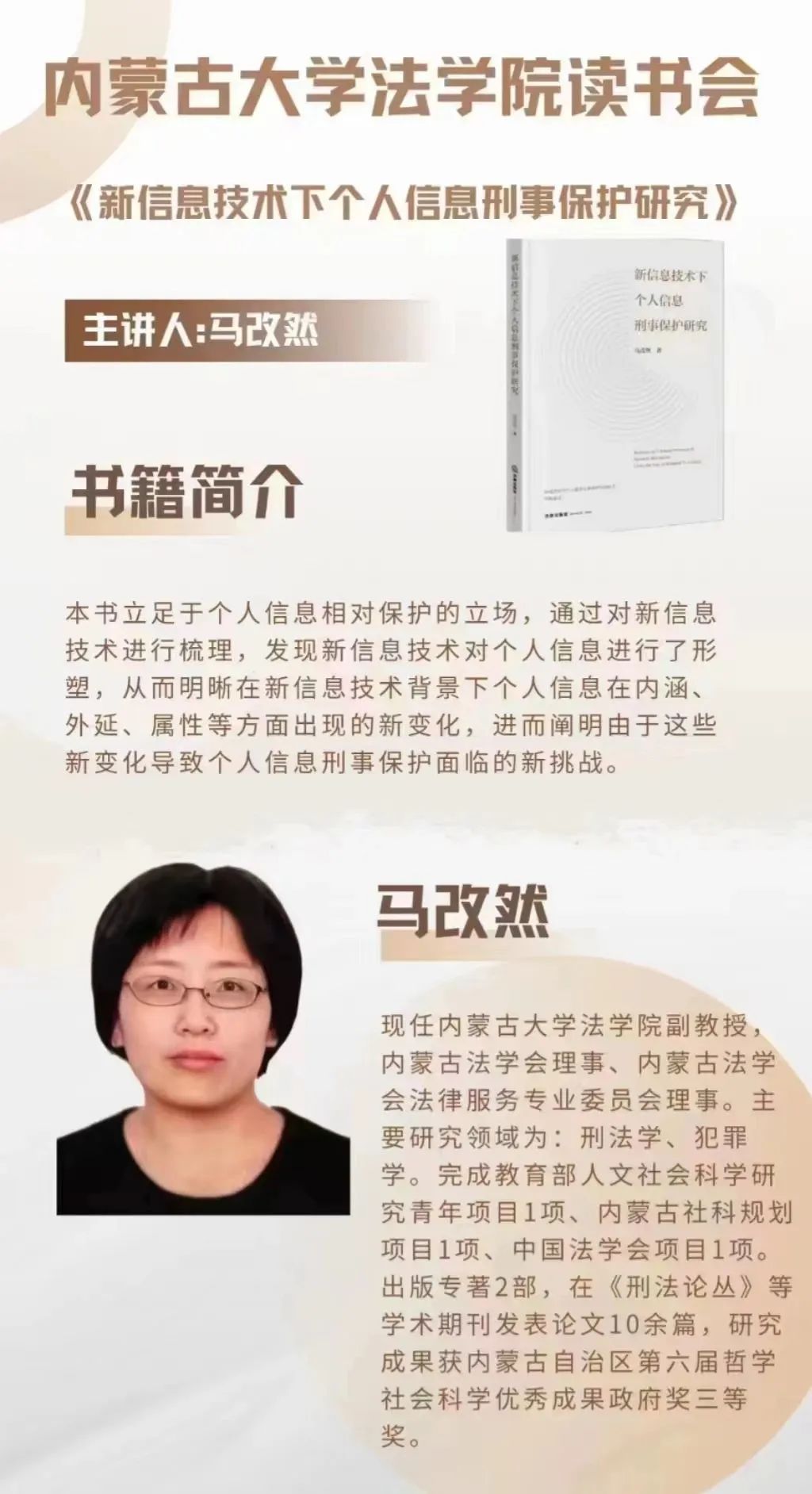 本次读书会围绕马改然老师著作《新信息技术下个人信息刑事保护研究》展开,针对信息时代个人信息的刑事保护问题进行了多个维度的剖析,老师同学积极交流、各抒己见。通过此次读书会,同学们提升了信息安全法律意识,掌握了相关法律知识,是太阳成集团tyc122ccvip师生之间进行学术交流的有益实践。