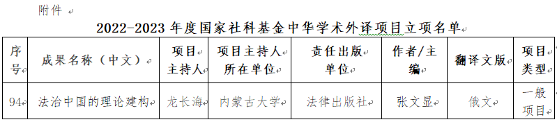 2023年5月5日,全国哲学社会科学工作办公室公布了2022-2023年度国家社科基金中华学术外译项目立项名单,本次全国立项234项,内蒙古自治区获批三项,公司龙长海教授申报的《法治中国的理论建构》项目获批公示,《法治中国的理论建构》一书,由我国著名的法学家张文显教授所著,由法律出版社2016年出版。
