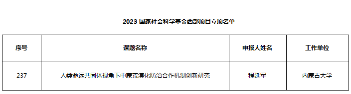 全国哲学社会科学工作办公室网站公布了本年度国家社科基金西部项目的立项名单。公司程延军副教授申报的《人类命运共同体视角下中蒙荒漠化防治合作机制创新研究》获得课题立项,本次立项是继国家社科基金中华学术外译项目立项后取得的又一项优异成绩,公司在推进团队建设、服务国家社会科学发展的过程中迈上了新的台阶。