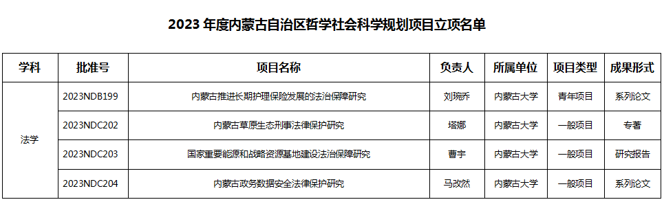 2023年12月12日,内蒙古社科规划网发布了《内蒙古自治区党委宣传部关于印发2023年度自治区哲学社会科学规划项目的通知》,公司塔娜教授、曹宇副教授、马改然副教授获批一般项目,刘琬乔博士获批青年项目。