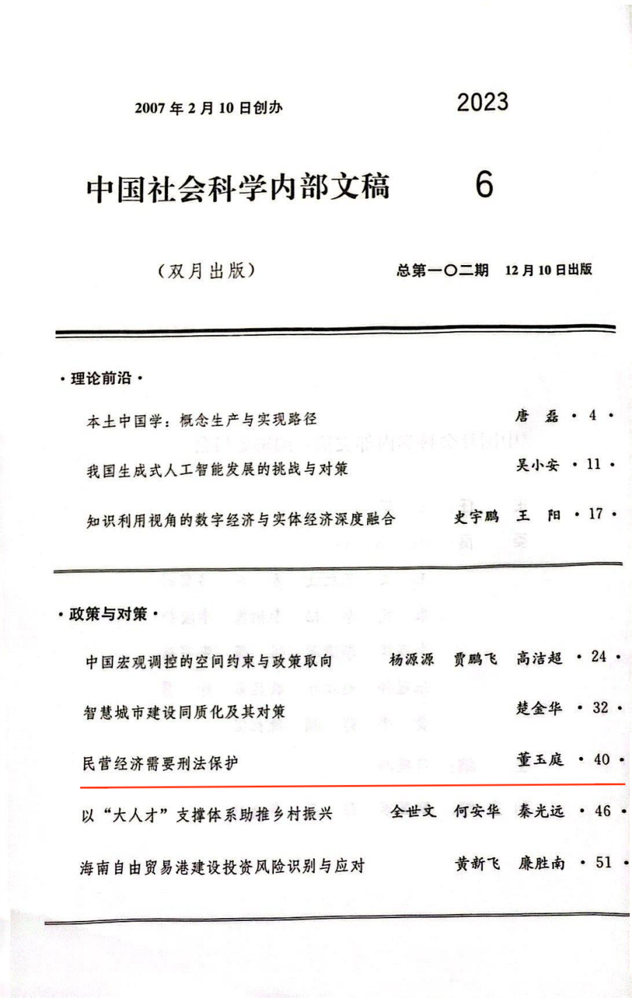 太阳成集团tyc122ccvip特聘教授董玉庭撰写的论文《民营经济需要刑法保护》发表于2023年第6期《中国社会科学内部文稿》。