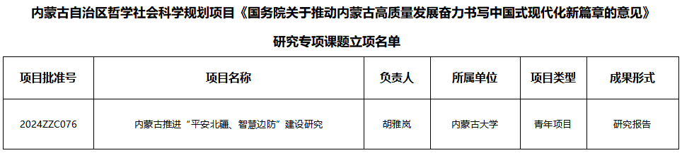 2024年2月27日,内蒙古社科规划网发布了《关于印发自治区哲学社会科学规划项目<国务院关于推动内蒙古高质量发展奋力书写中国式现代化新篇章的意见>研究专项课题的通知》,公司胡雅岚博士获批青年项目。