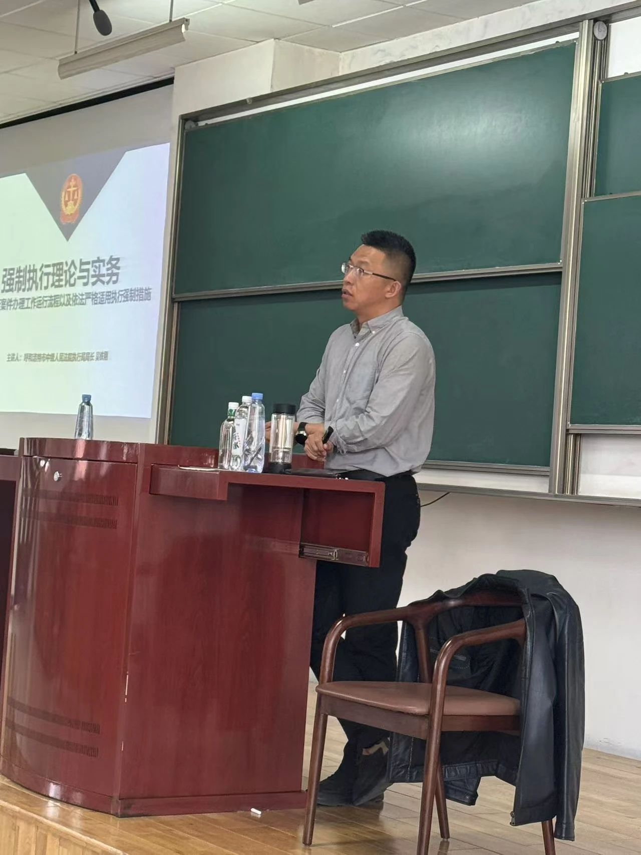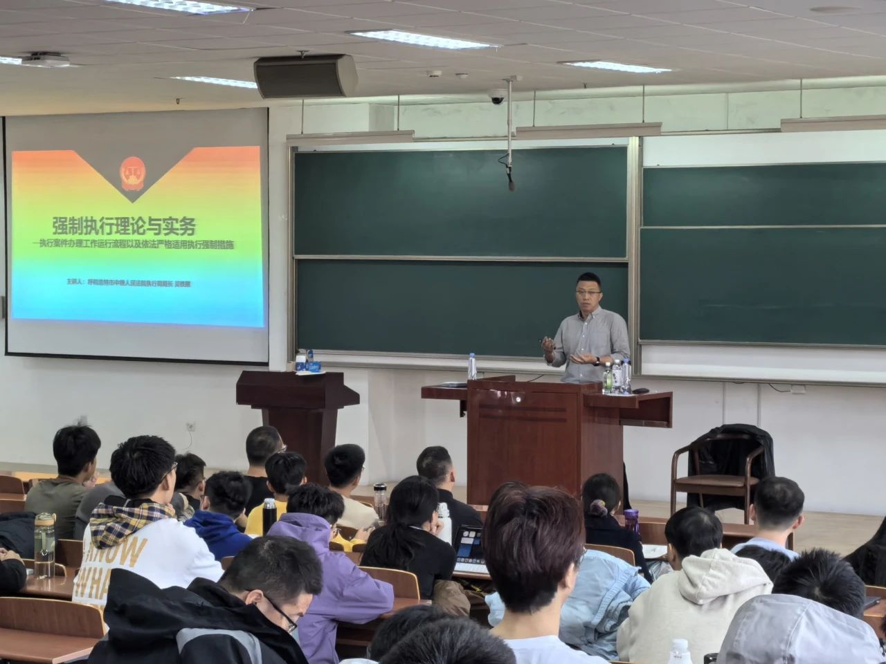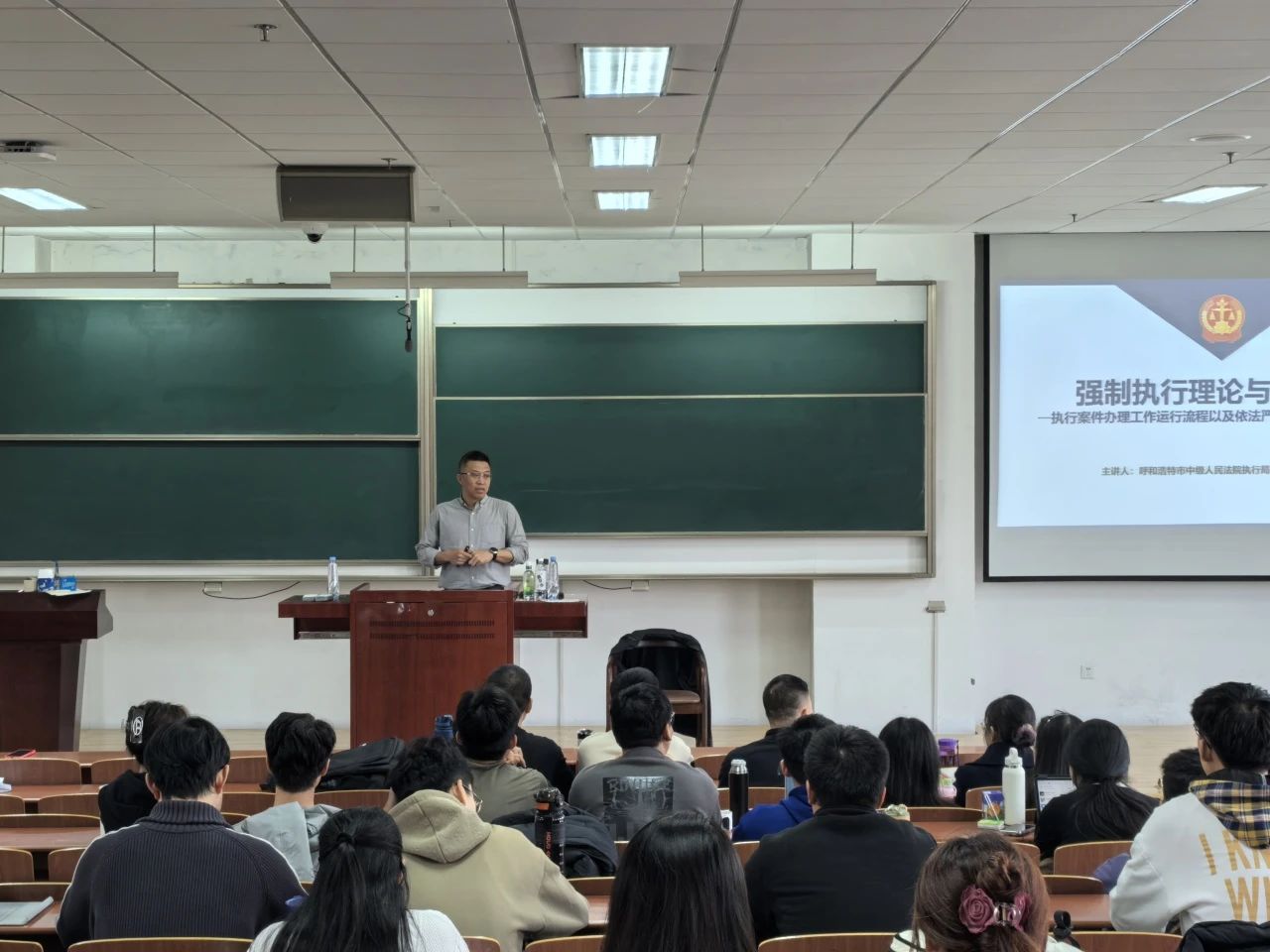 2024年11月20日下午,呼和浩特市中级人民法院执行局吴铁刚局长在玉泉校区卓越楼阶3A教室围绕“强制执行理论与实务——执行案件办理工作运行流程以及依法严格适用执行强制措施”开展专题讲座。讲座由高芙蓉副教授主持,公司研究生和本科生热情参与。