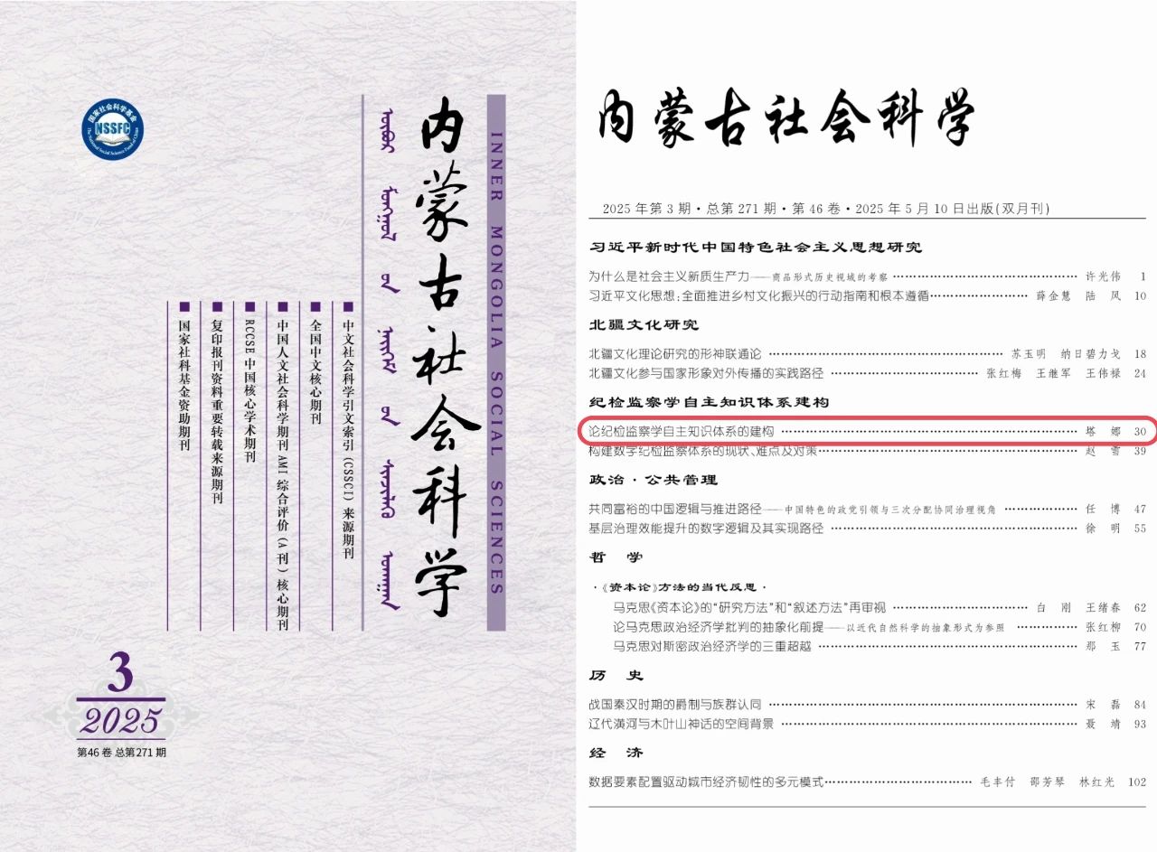 公司塔娜教授在《内蒙古社会科学》发表学术论文《论纪检监察学自主知识体系的建构》。