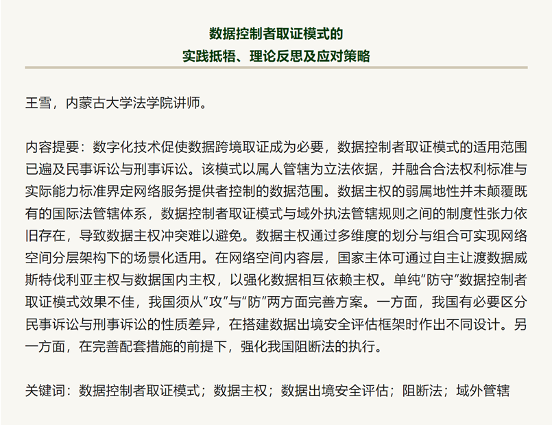 王雪博士撰写的学术论文《数据控制者取证模式的实践抵牾、理论反思及应对策略》在法学核心期刊《环球法律评论》(2025年第3期)发表。