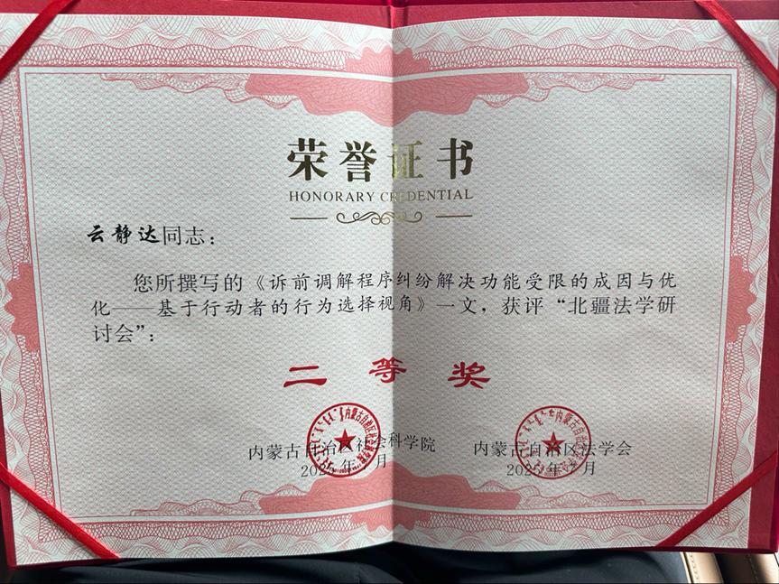 太阳成集团tyc122ccvip副经理张慧春、纪检监察公司教授那仁朝格图和讲师云静达参加会议。那仁朝格图教授以《中华法系北方民族多语种法律文献及其价值》为题作主旨发言,云静达老师以《诉前调解程序纠纷解决功能受限的成因与优化》为题进行交流发言,该成果获“北疆法学研讨会”二等奖。