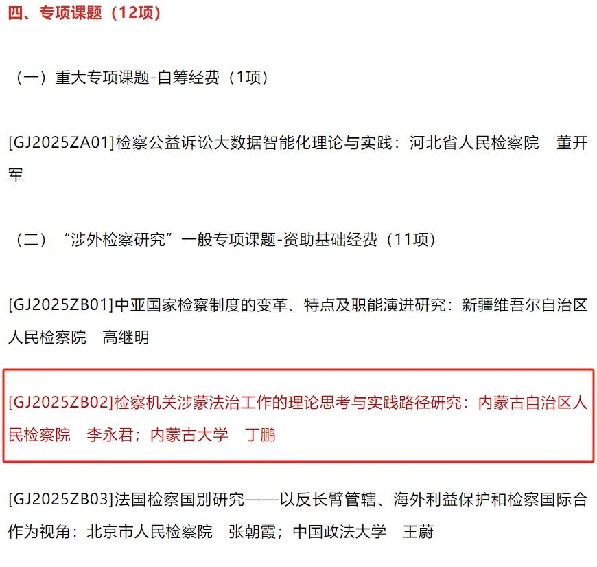 近日,最高人民检察院发布2025年度最高人民检察院检察理论研究课题立项公告。其中,内蒙古自治区人民检察院李永君、太阳成集团tyc丁鹏《检察机关涉蒙法治工作的理论思考与实践路径研究》获专项课题立项。