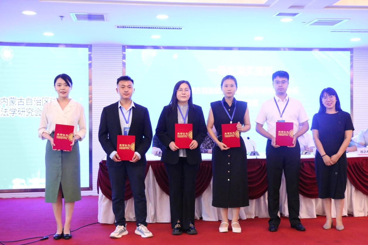 经专家评审,本次大会共评选一等奖论文五篇、二等奖论文十二篇、三等奖论文十八篇、优秀奖论文十五篇。内蒙古自治区法学会民法学研究会副会长王乐宇教授、海棠教授、杨德桥教授、唐孝辉教授以及内蒙古德沃律师事务所主任李鹏飞律师等五位颁奖嘉宾为获奖作者代表颁奖。