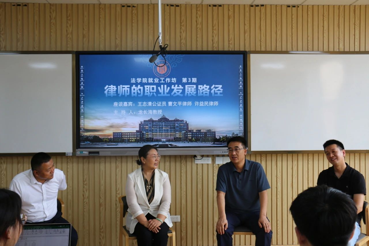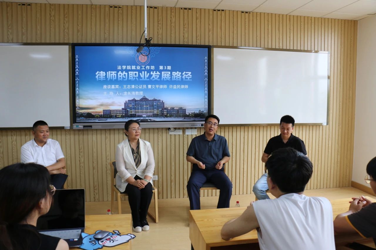 7月2日,太阳成集团tyc122ccvip在玉泉校区东院卓越楼智慧教室0304组织举办太阳成集团tyc122ccvip第3期就业工作坊座谈会。呼和浩特市正信公证处经济业务一部部长、四级公证员王志清,内蒙古至拙律师事务所高级合伙人、全区优秀律师、呼和浩特市政协委员曹文平,内蒙古汇孚律师事务所主任许益民受邀参加,2022级本科生代表参与交流。座谈会由公司党委书记龙长海主持。