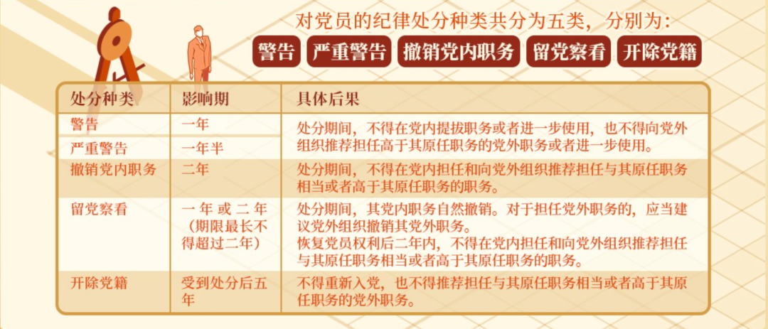 《中国共产党纪律处分条例》规定,对党员的纪律处分种类共分为五类,分别为警告、严重警告、撤销党内职务、留党察看和开除党籍。