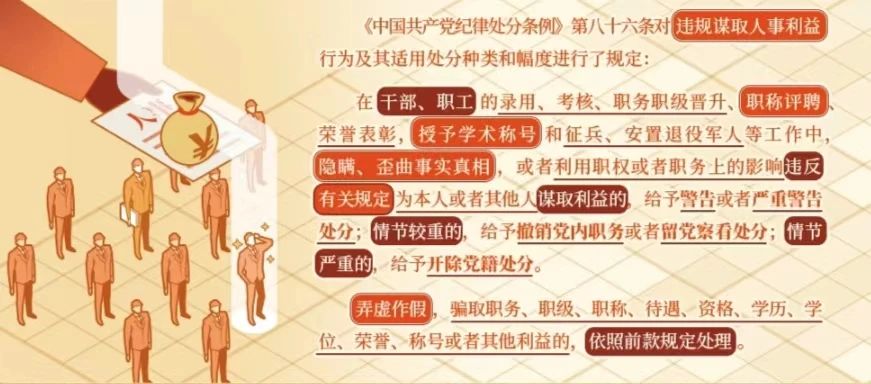 组织人事工作涉及广大干部、职工切身利益,关系干部、职工队伍的素质和稳定,事关人才评价机制落实。《中国共产党纪律处分条例》第八十六条对违规谋取人事利益行为及其适用处分种类和幅度进行了规定: